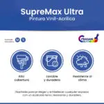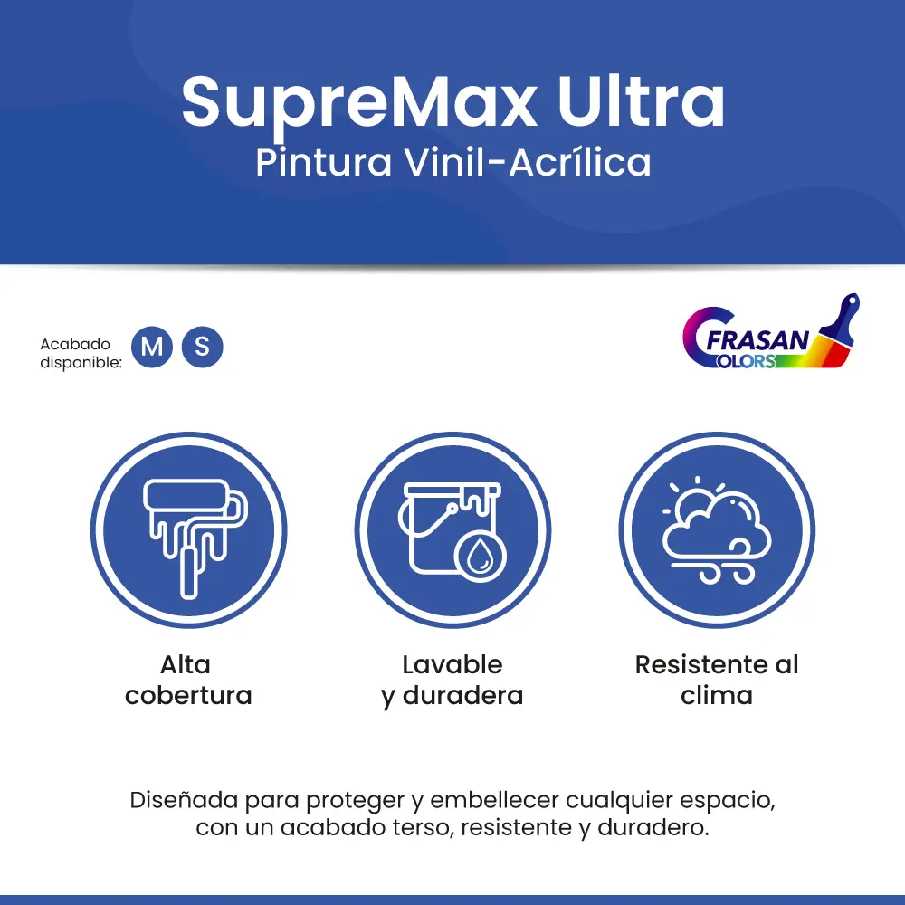 La pintura vinil-acrílica SUPREMAX ULTRA ofrece el balance perfecto entre cobertura, durabilidad y resistencia a la intemperie. Su fórmula está diseñada para mantener un acabado terso, alta lavabilidad y excelente nivelación incluso en condiciones ambientales exigentes.