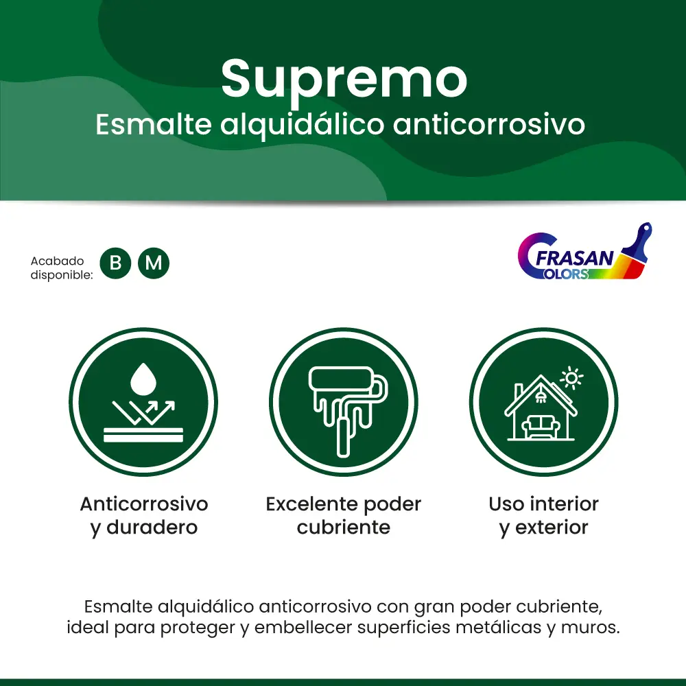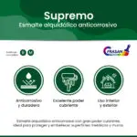 SUPREMO es un esmalte alquidálico anticorrosivo de alto desempeño, libre de plomo, diseñado para ofrecer un excelente poder cubriente y una gran durabilidad. Su fórmula está pensada para resistir ambientes con alta humedad y exposición a la intemperie, protegiendo eficazmente contra la corrosión.
